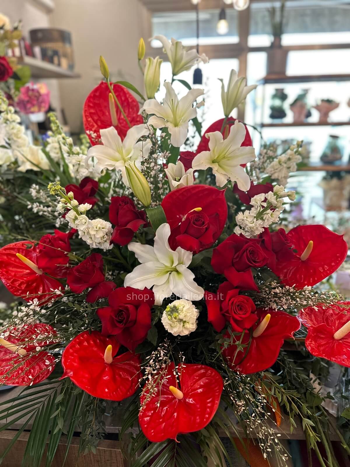 Cesto funebre rosso con anthurium rose e lilium