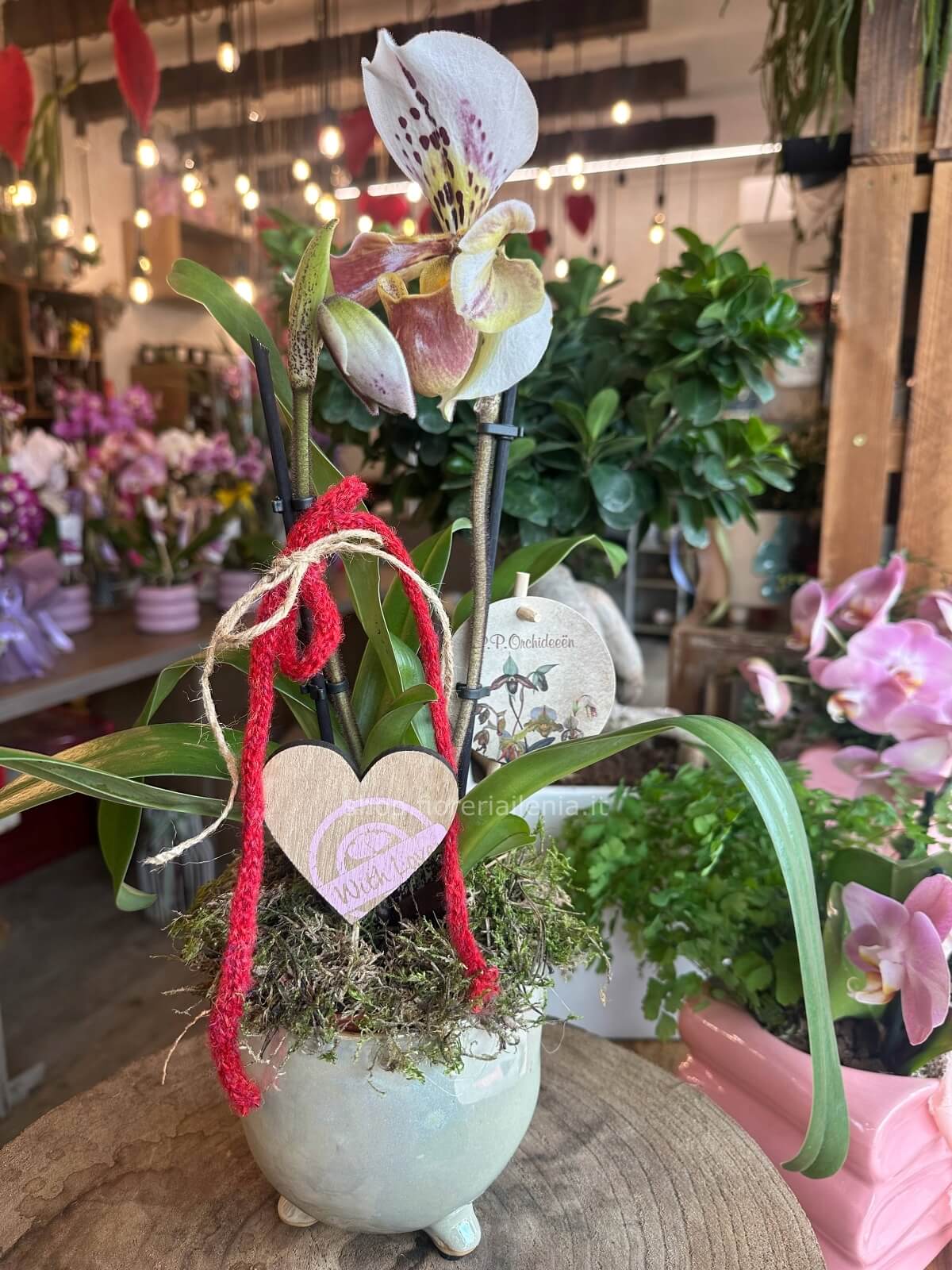 | Paphiopedilum con vaso ceramica, h circa 48 cm, 2 steli Cod. 124560 | € 58,00 | Quantità : | |